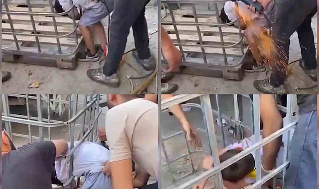Kafesin parmaklıklarına sıkışan çocuk, demir kesilerek kurtarıldı