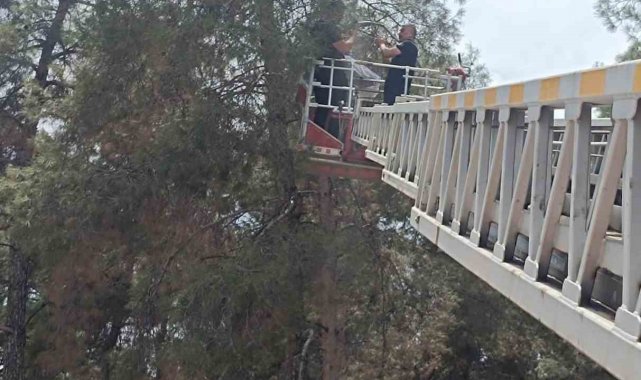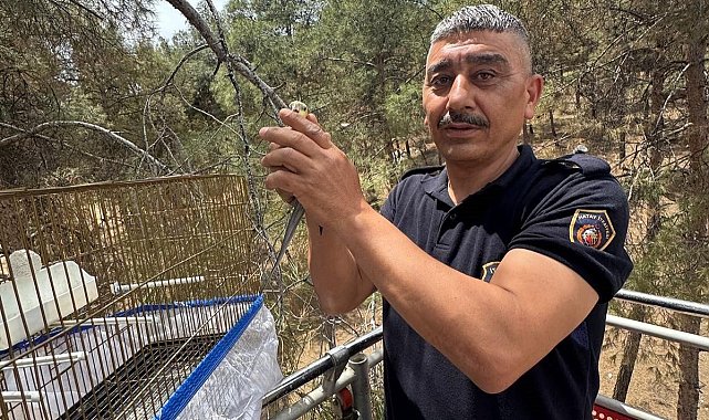 Hatay'da kafesinden kaçarak ağaçta mahsur kalan muhabbet kuşunu itfaiye ekipleri kurtardı.