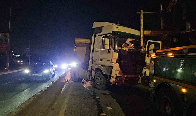 Kağıthane'de hafriyat kamyonunun sürücüsü aracının kontrolünü kaybetti. Beton bariyere çıkan kamyon, çekici yardımıyla asılı kaldığı yerden kurtarıldı.