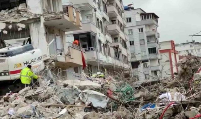 Kahramanmaraş merkezli depremlerin ciddi hasara neden olduğu Gaziantep'in Nurdağı ilçesinde ağır hasarlı binalarda yıkım çalışması yapan ekipler binada asılı bulunan Türk bayrağını hassasiyetle indirdi.