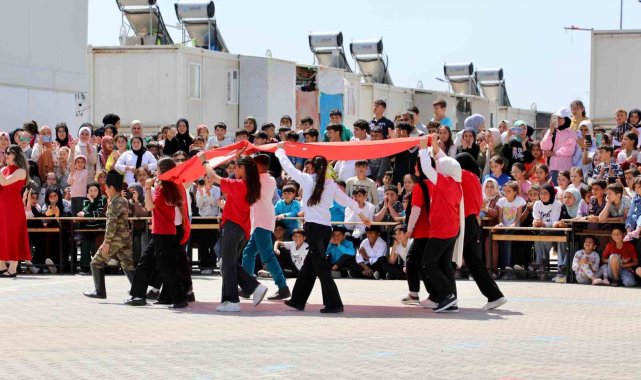 Kahramanmaraş Geçici Barınma Merkezinde eğitim gören imam hatip öğrencilerinin hazırladığı 23 Nisan Ulusal Egemenlik ve Çocuk Bayramı coşkusu, öğrencilerin kortej geçişiyle başladı. Ellerinde 16 Türk devletinin bayraklarını taşıyan öğrenciler, büyük bir gurur ve coşkuyla sahnede yer aldı. Saygı duruşu ve İstiklal Marşının okunmasının ardından, sınıf öğretmenlerinin rehberliğinde hazırlanan gösteriler sahnelendi. Gösterilerde öğrenciler tarafından okunan şiirler, sergilenen halk oyunları ve çeşitli etkinlikler izleyicilerden büyük alkış aldı. Mülteci çocuklar da programda yer alarak Türkiye'ye duydukları minneti dile getirdi.