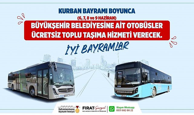 Kahramanmaraş Büyükşehir Belediyesi otobüslerinde Kurban Bayramı boyunca vatandaşlara ücretsiz toplu taşıma hizmeti verileceği bildirildi.