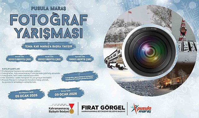 Kahramanmaraş Büyükşehir Belediyesinin gençlere yönelik markası "Pusula Maraş", şehrin doğal güzelliklerini ve kış atmosferini yansıtan özel bir etkinliğe daha imza atıyor. Bu kapsamda, "Kar Maraş'a Başka Yakışır" temalı fotoğraf yarışması başlatıldı. Kahramanmaraş il sınırları içerisinde çekilen kar temalı fotoğrafların yarışacağı etkinliğe başvurular başladı. Fotoğraf tutkunlarını ve gençleri bir araya getirmeyi amaçlayan yarışma ile şehrin beyaz örtü altındaki eşsiz manzaralarının objektiflere yansıması hedefleniyor. Yarışmaya katılmak isteyenler, tema ile uyumlu olarak çektikleri bir fotoğrafı, "Pusula Maraş"'ın instagram hesabına mesaj (DM) yoluyla göndererek başvuruda bulunabilecek. Katılımın ücretsiz olduğu yarışmada, başvurular 5 Ocak Pazartesi günü sona erecek. Başvuruların tamamlanmasının ardından jüri tarafından yapılacak değerlendirme sonucunda dereceye giren katılımcılar 9 Ocak Cuma günü kamuoyuna duyurulacak. Yarışmada birinci olan katılımcıya 3 bin TL, ikinciye 2 bin TL, üçüncüye ise bin TL değerinde hediye çeki verilecek. "Pusula Maraş" tarafından yapılan açıklamada, yarışmaya ilişkin tüm detaylara ve başvuru şartları sosyal medya hesabı üzerinden ulaşılabileceği belirtildi.