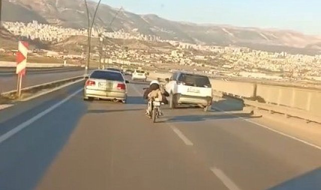 Kahramanmaraş'ın Onikişubat ilçesinde bir motosiklet sürücüsünün tehlikeli yolculuğu cep telefonu kamerasına yansıdı.