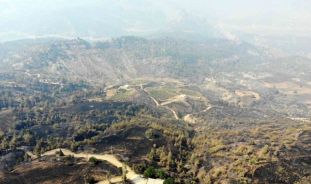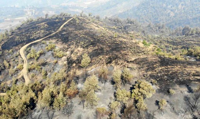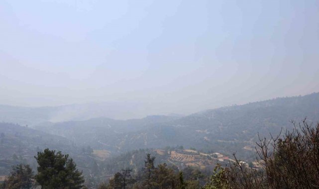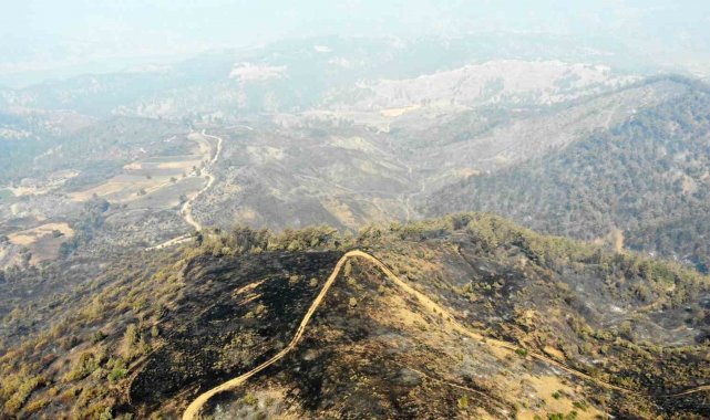 Yangının etkili olduğu ormanlık alandan yükselen dumanlar dron ile görüntülendi. Sarp ve ormanlık alandaki duman yoğunluğu dikkat çekti.