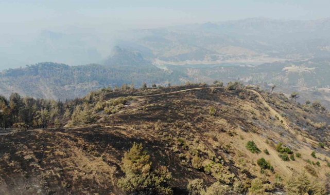 Kahramanmaraş'ta ormanlık alanda cumartesi günü çıkan 3'üncü günün sonunda kontrol altına alınan yangında soğutma çalışması sürüyor. Bin 500 hektarlık küle dönen alan dron ile görüntülendi.