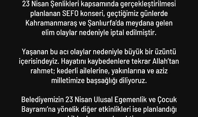 Büyükşehir Belediyesi tarafından yapılan açıklamada, son günlerde Kahramanmaraş ve Şanlıurfa'da meydana gelen elim olaylar nedeniyle konser programında değişikliğe gidildiği belirtildi. Açıklamada, yaşanan acı hadiseler dolayısıyla derin bir üzüntü içerisinde olunduğu ifade edilerek, hayatını kaybeden vatandaşlara Allah'tan rahmet, kederli ailelerine ve yakınlarına başsağlığı dilekleri iletildi. 23 Nisan Ulusal Egemenlik ve Çocuk Bayramı kapsamında planlanan diğer etkinliklerin ise program dahilinde gerçekleştirilmeye devam edeceği bildirildi.