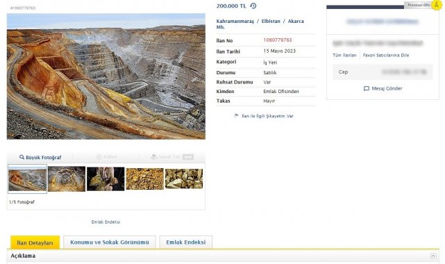 Kahramanmaraş'ın Elbistan ilçesinde, 200 hektarlık alana sahip olduğu belirtilen altın madeni sahası, bir ilan sitesinde 200 bin liraya satışa çıkarıldı.