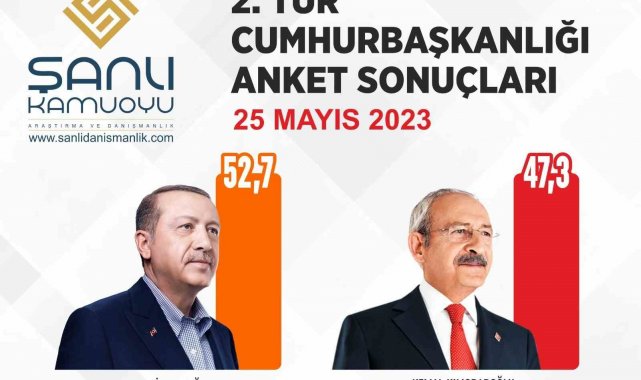 14 Mayıs Cumhurbaşkanlığı seçiminden 2 gün önce sonuçlara en yakın sonuçları açıklayan Şanlı Kamuoyu Araştırma ve Danışmanlık Şirketi, 28 Mayıs 2023 Pazar günü yapılacak Cumhurbaşkanlığı ikinci tur seçimleri başlıklı anket sonuçlarını da paylaştı