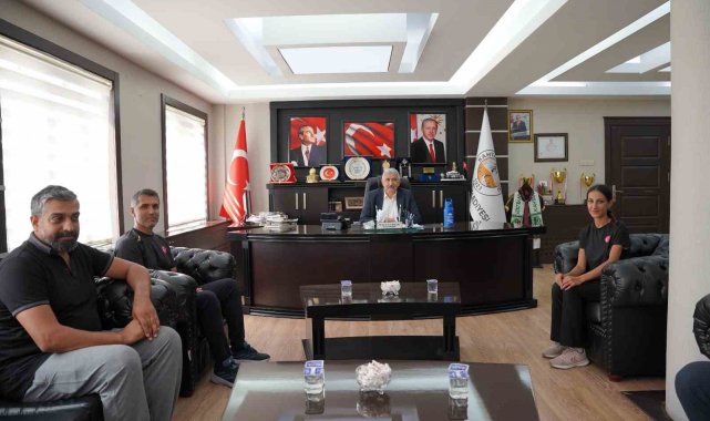 Kahta Belediye Başkanı Mehmet Can Hallaç, başarılı sporcu Kader Güvenç ile antrenörleri Mehmet Teke ve İbrahim Şabaş'ı kabul etti.