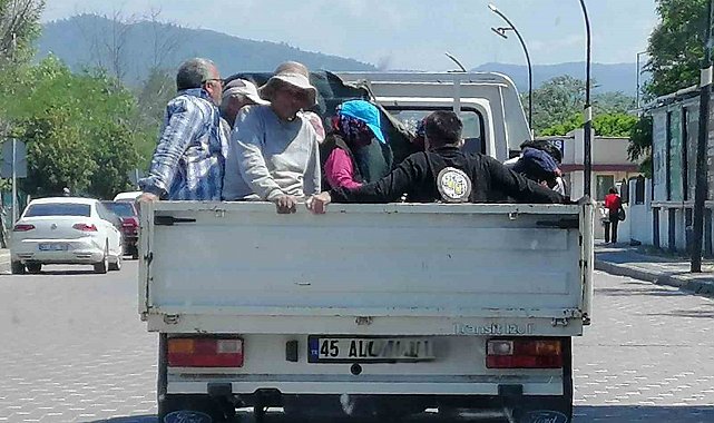 Manisa'nın Turgutlu ilçesinde açık kasa kamyonetin kasasında, emniyetsiz bir şekilde taşınan çok sayıda kişi yolda giden başka bir vatandaş tarafından görüntülendi. Görüntülerde, aralarında kadın ve erkeklerin bulunduğu yaklaşık 10 kişinin kamyonet kasasında ayakta veya oturarak yolculuk ettiği görülüyor. Güneşten korunmak için şapkalar ve örtüler kullanan tarım işçilerin bu şekilde taşınması, hem yolcuların hem de diğer sürücülerin hayatını tehlikeye atarken vatandaşlar özellikle tarım sezonunda denetimlerin daha da artırılmasını istedi.