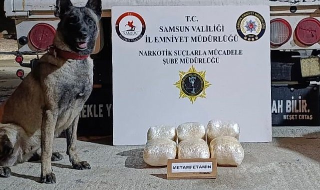 Samsun'da kamyonete gizlenmiş uyuşturucuyu narkotik dedektör köpeği Şila bulurken, 4 kilo 975 gram metamfetamin ve 4 bin 840 adet extacy hap ele geçirildi.
