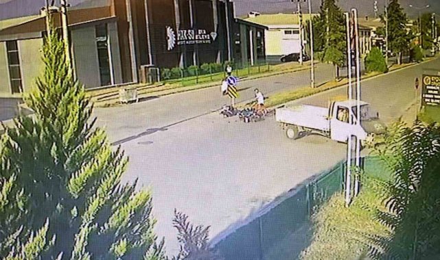 Bursa'nın İnegöl ilçesinde meydana gelen kazada kamyonet ile çarpışan motosikletin sürücüsü yaralandı. Kaza anı bir iş yerinin güvenlik kamerasına saniye saniye yansıdı.