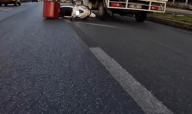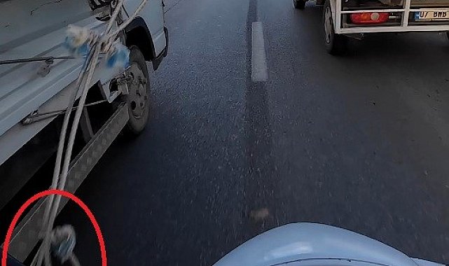 Antalya'da iki kamyonet arasından geçmeye çalışan motokurye, sarkan branda ipine takılarak yola savruldu. Kamyonet tekerlerinin altında kalmaktan son anda kurtulan motosikletlinin ölümle burun buruna geldiği anlar, kask kamerasına saniye saniye yansıdı.