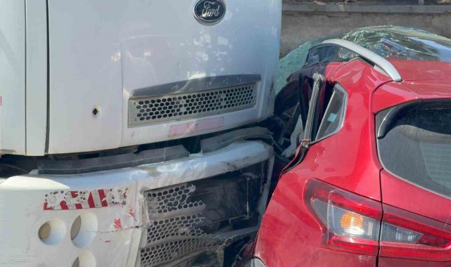 Kamyonun sürüklediği otomobilden burunları bile kanamadan çıktılar