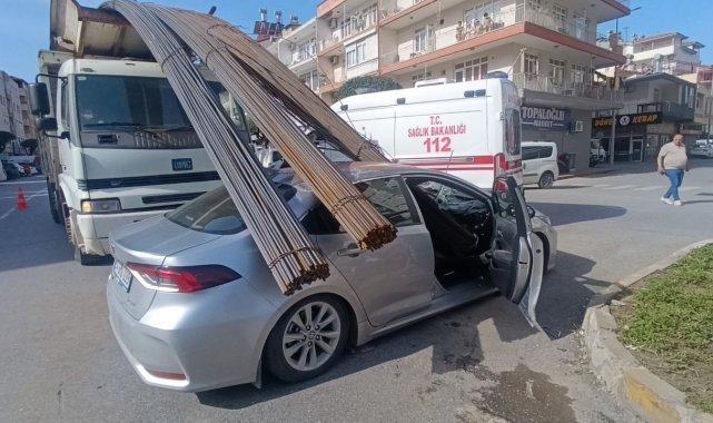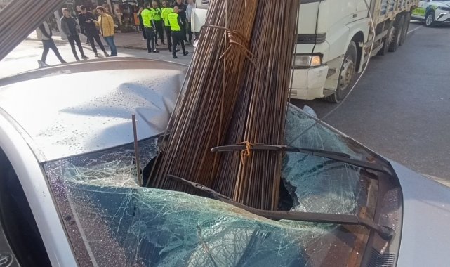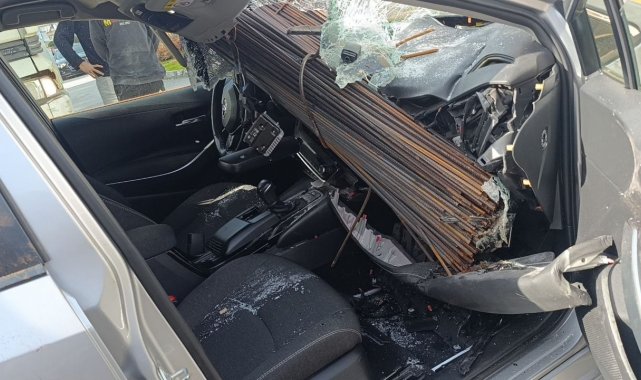 Kamyonun üzerindeki inşaat demirleri seyir halindeki otomobile 'ok' gibi saplandı