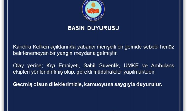Açıklamada, "Kandıra Kefken açıklarında yabancı menşeli bir gemide sebebi henüz belirlenemeyen bir yangın meydana gelmiştir. Olay yerine; Kıyı Emniyeti, Sahil Güvenlik, UMKE ve ambulans ekipleri yönlendirilmiş olup, gerekli müdahaleler yapılmaktadır. Geçmiş olsun dileklerimizle, kamuoyuna saygıyla duyurulur" ifadeleri yer aldı.