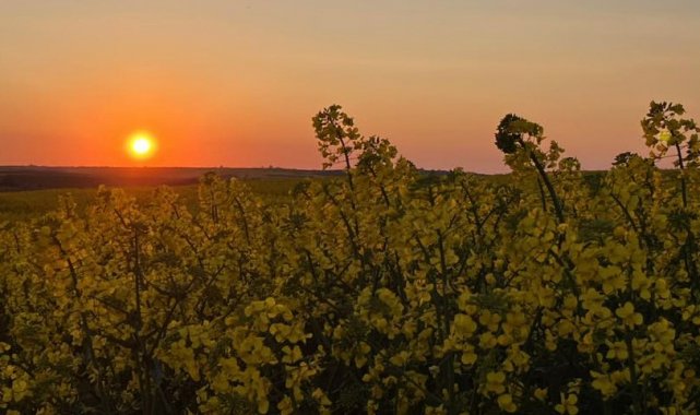Tekirdağ'ın Hayrabolu ilçesinde kanola tarlaları, gün batımında ortaya çıkan renk cümbüşüyle görsel şölen sundu. Sarının en canlı tonlarına bürünen tarlalar kızıl gün batımıyla birleşince eşsiz manzaralar oluşturdu.