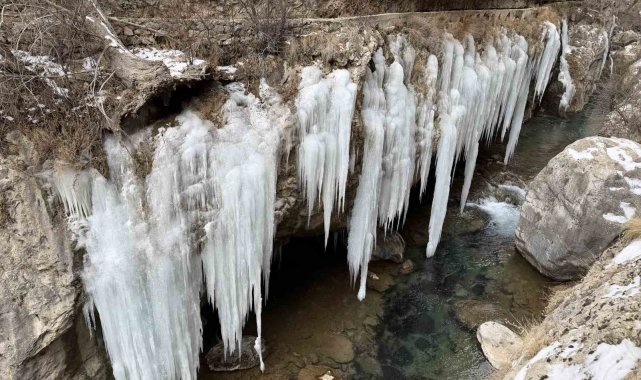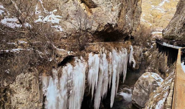 Sivas'ta bulunan ve binlerce yıllık geçmişi olan Şuğul Kanyonu'nda devasa buz sarkıtları oluştu. Boyları 5 metreyi bulabilen buz sarkıtları, Sivas'ta soğuk havanın boyutunu gözler önüne serdi.