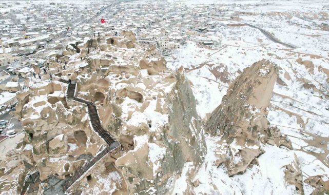 Kapadokya bölgesinin en uç noktası olan ve Dünyanın en büyük doğal gökdeleni olma özelliğini taşıyan Uçhisar Kalesi kar yağışı ile birlikte beyaza büründü. Ortaya kartpostallık görüntüler çıktı. Karlar altındaki Uçhisar Kalesi dron ile görüntülendi.