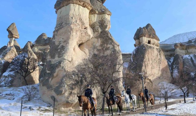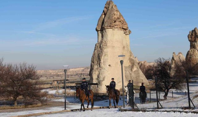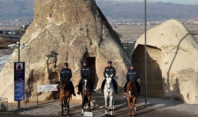 Kapadokya'nın doğal ve tarihi yapısına uygun şekilde görev yapan atlı jandarma timleri, hem vatandaşların hem de bölgeyi ziyaret eden turistlerin güvenliğini sağlarken, bölgenin simgelerinden biri haline gelerek ziyaretçilerin de ilgisini çekiyor.