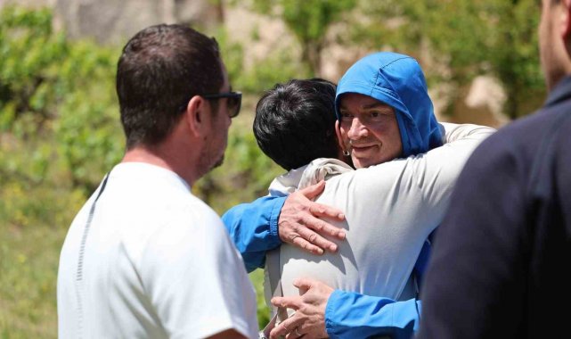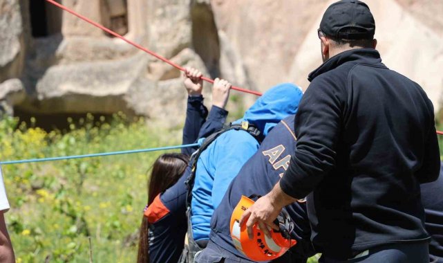 Nevşehir'de peri bacalarının üzerine güvenli iniş yapan sıcak hava balonunun sepetinden inerek bölgede mahsur kalan turistleri kurtarmak için çalışma başlatıldı.
