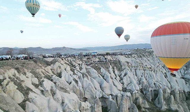 Sabahın erken saatlerinde Göreme beldesine bağlı Aşk Vadisinden havalanan 156 sıcak hava balonları ile yaklaşık 3 bin 500 yerli ve yabancı turist Kapadokya bölgesini kuş bakışı izleme fırsatı buldu. Balonlarda yer bulamayan turistler ise Kapadokya vadilerini doldurarak bu görsel şöleni izledi.