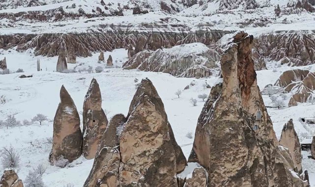 Türkiye'nin önemli turizm merkezlerinden Kapadokya'da etkili olan kar yağışı peribacalarını beyaza bürüyerek kartpostallık manzaralar oluşturdu. O manzara dron ile havadan görüntülendi.