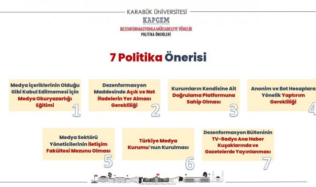 Karabük Üniversitesi Kamu Politikaları Araştırma ve Geliştirme Merkezi (KAPGEM) tarafından hazırlanan "Dezenformasyonla Mücadeleye Yönelik Politika Önerileri" raporunda, sahte haber ve bilgi kirliliğiyle mücadele için yedi somut politika önerisi sunuldu. Raporun tanıtım toplantısına RTÜK Üyesi Dr. Deniz Güçer de katıldı.