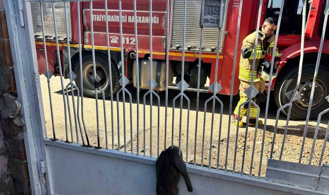 Kapı korkuluğuna sıkışan kediyi itfaiye kurtardı