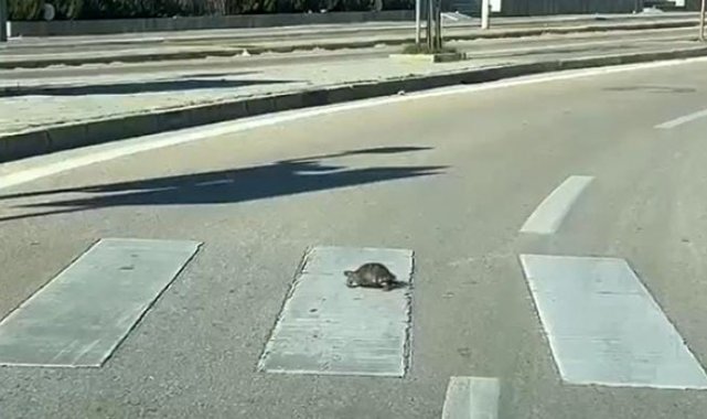 Kaplumbağa yaya geçidinden geçti, kurallara uymasıyla vatandaşlara örnek oldu