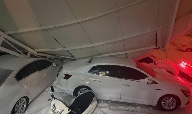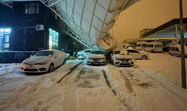 Kar ağırlığına dayanamayan sundurmanın araçların üzerine çöktüğü anlar kamerada