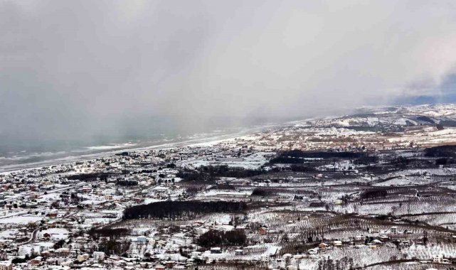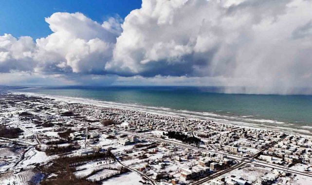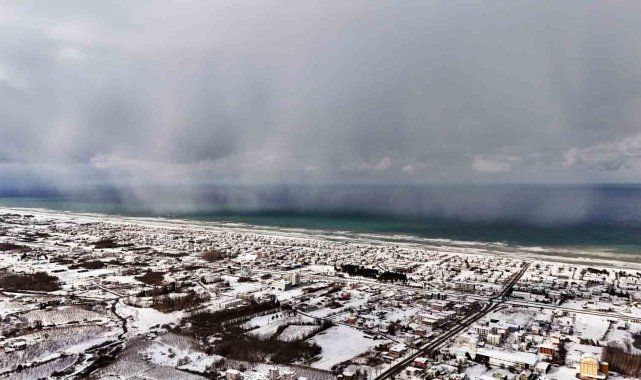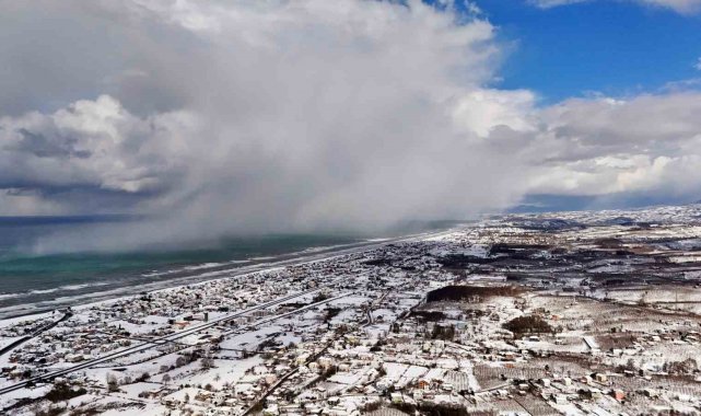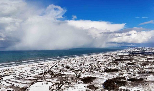 Sakarya'da etkili olan kar yağışı, Karadeniz'e kıyı Kocaali ilçesini de beyaz bürüdü. Beyaza bürünen bölgede Karadeniz'in, kar bulutları ile buluşması kartpostallık görüntüler ortaya çıkardı. Seyrine doyumsuz manzaranın oluştuğu bölge dron ile görüntülendi.