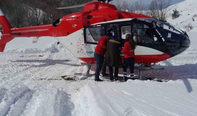 Tokat'ın Almus ilçesinde yaşayan 65 yaşındaki kadın hasta, yoğun kar yağışı nedeniyle kara yolu ulaşılamayınca helikopter ambulansla hastaneye sevk edildi.
