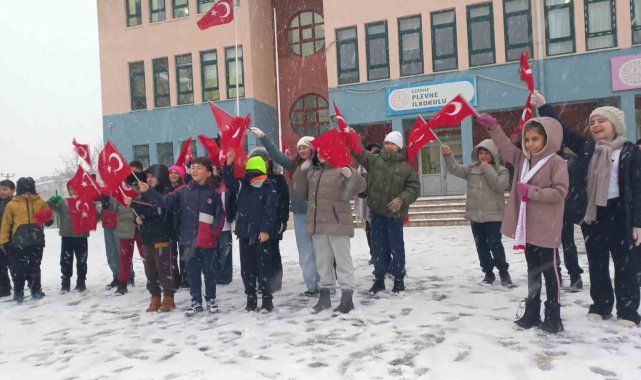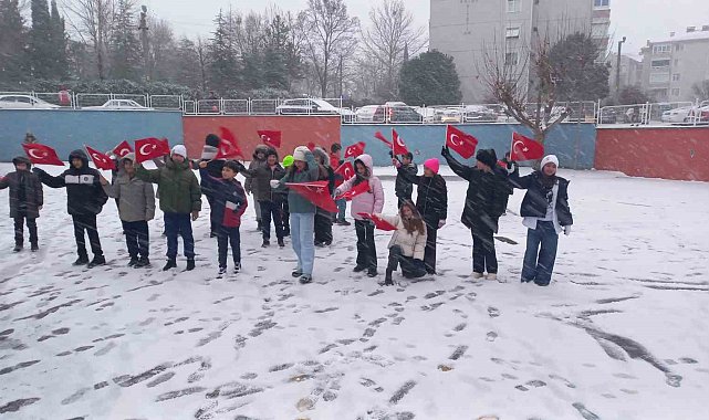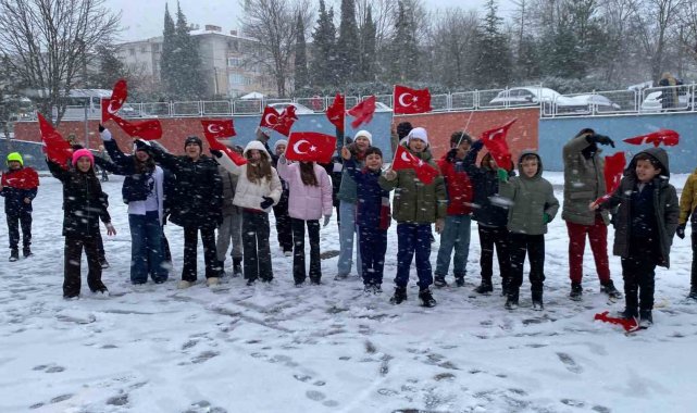Kar taneleri arasında dalgalanan bayraklar, beyaza bürünen okul bahçesinde bayrak sevgisinin sıcaklığını bir kez daha gözler önüne serdi.