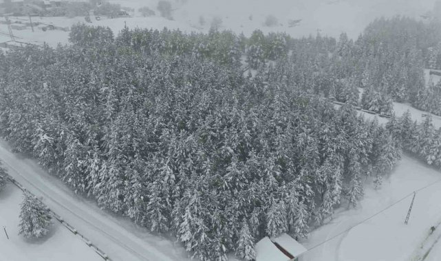 Kar yağışıyla birlikte havadan görüntülenen ilçede yetkililer sürücüleri ve vatandaşları kar yağışı nedeniyle dikkatli olmaları konusunda uyardı.