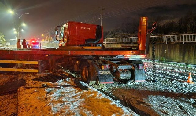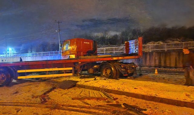 Kar sebebiyle kayganlaşan yolda makaslayan tırın sürücüsü yaralandı