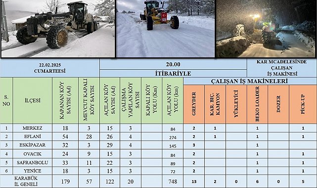 Karabük Valiliği'nden yapılan açıklamada, "21 Şubat 2025 Cuma günü ilimizde etkili olan yoğun kar yağışı sonrası 179 köy yolumuz ulaşıma kapanmıştır. İl Özel İdaremize bağlı ekiplerimiz, 26 iş makinesi ve 74 personel ile aralıksız çalışarak 748 km uzunluğundaki 122 köy yolunu yeniden ulaşıma açmış bulunmaktadır" denildi.