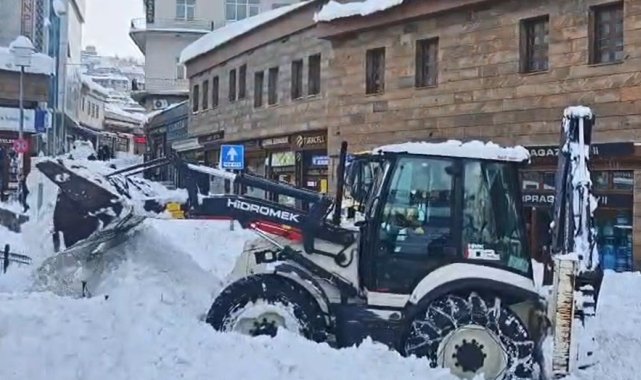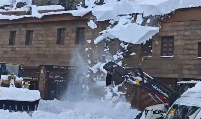 Bitlis'te bir binanın çatısında biriken tonlarca ağırlıktaki kar kütlesinin iş makinesinin üzerine düşmesi paniğe neden oldu.