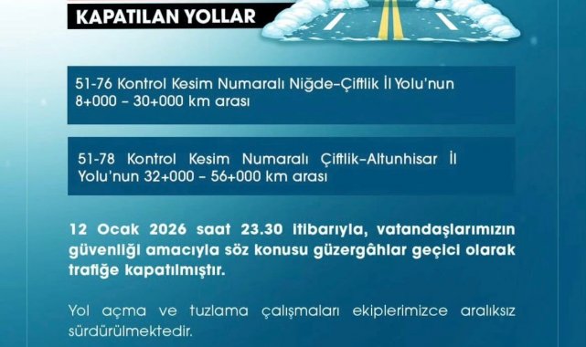 Valilikten yapılan açıklamaya göre, Niğde-Çiftlik yolunun 8 ile 30'uncu kilometreleri arasındaki bölüm ile Çiftlik-Altunhisar yolunun 32 ile 56'ncı kilometreleri arası, vatandaşların can ve mal güvenliğinin sağlanması amacıyla 12 Ocak 2026 saat 23.30 itibarıyla geçici olarak trafiğe kapatıldı. Açıklamada, kapatılan güzergahlarda yol açma ve tuzlama çalışmalarının ekipler tarafından aralıksız sürdürüldüğü belirtilirken, yolların yeniden trafiğe açılmasına ilişkin gelişmelerin kamuoyuyla paylaşılacağı ifade edildi.