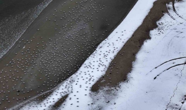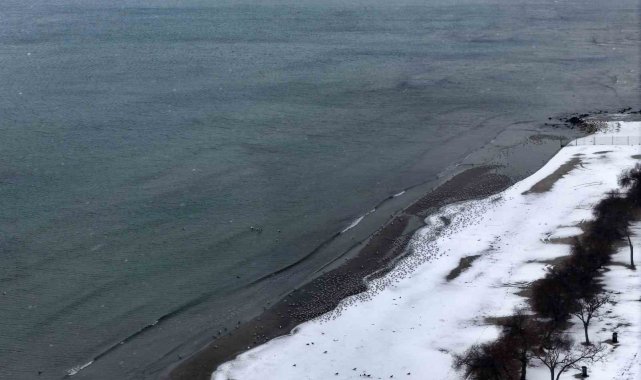 Kar yağışı ile beyaza bürünen Menekşe sahili havadan görüntülendi