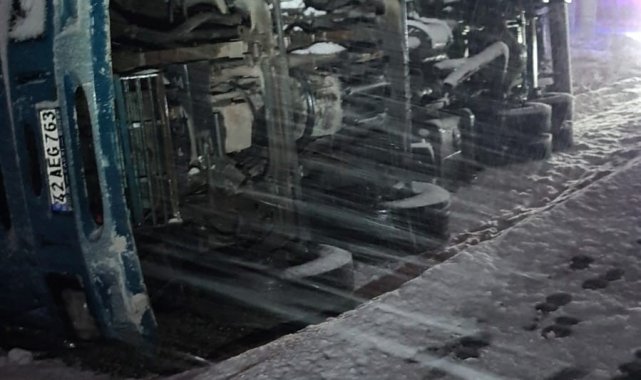 Kar yağışı nedeniyle kayganlaşan yolda kontrolden çıkan kamyon devrildi: 1 yaralı