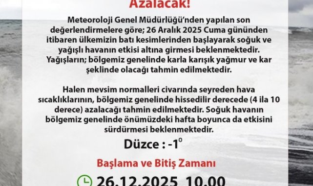 Düzce Valiliği, Meteoroloji Genel Müdürlüğü'nden yapılan son değerlendirmeleri paylaştı. Valilik'ten yapılan açıklamada, "Meteoroloji Genel Müdürlüğü'nden yapılan son değerlendirmelere göre 26 Aralık 2025 Cuma gününden itibaren ülkemizin batı kesimlerinden başlayarak soğuk ve yağışlı havanın etkisine girmesi beklenmektedir. Yağışların bölgemiz genelinde karla karışık yağmur ve kar şeklinde olacağı tahmin edilmektedir. Halen mevsim normalleri civarında seyreden hava sıcaklıklarının bölgemiz genelde hissedilir derecede 4 ile 10 derece azalacağı tahmin edilmektedir. Soğuk havanın bölgemiz genelinde önümüzdeki hafta boyunca da etkisini sürdürmesi beklenmektedir" denildi.
