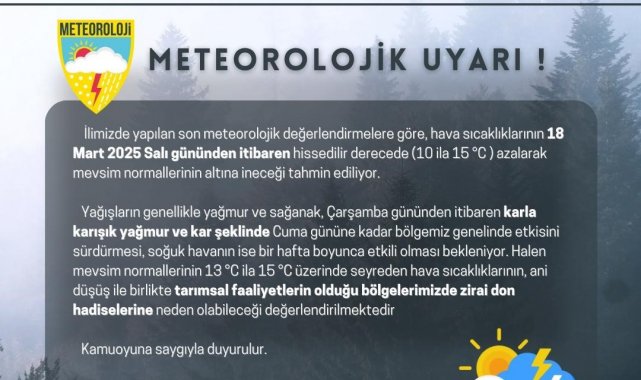 Valilikten yapılan açıklamada; "İlimizde yapılan son meteorolojik değerlendirmelere göre, hava sıcaklıklarının 18 Mart 2025 Salı gününden itibaren hissedilir derecede ( 10 ila 15 derece) azalarak mevsim normallerinin altına ineceği tahmin ediliyor. Yağışların genellikle yağmur ve sağanak Çarşamba gününden itibaren karla karışık yağmur ve kar şeklinde Cuma gününe kadar bölgemiz genelinde etkisini sürdürmesi, soğuk havanın ise bir hafta boyunca etkili olması bekleniyor. Halen mevsim normallerinin 13 ila 15 derece üzerinde seyreden hava sıcaklıklarının, anı düşüşle birlikte tarımsal faaliyetlerin olduğu bölgelerimizde zirai don hadiselerine neden olabileceği değerlendirmektedir" denildi.