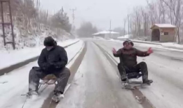 Yazıbağları Mahallesi'nde yaşayan Hüseyin Çalışkan (49) ve ağabeyi Dursun Çalışkan (65), araçlarının arkasına bağladıkları kızaklarla karlı yolda kayıp çalan müzik eşliğinde keyif sürdüler. O anları da cep telefonu kamerasıyla görüntülettiler.