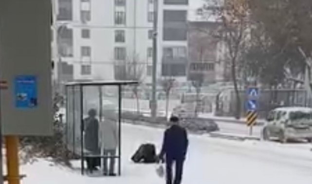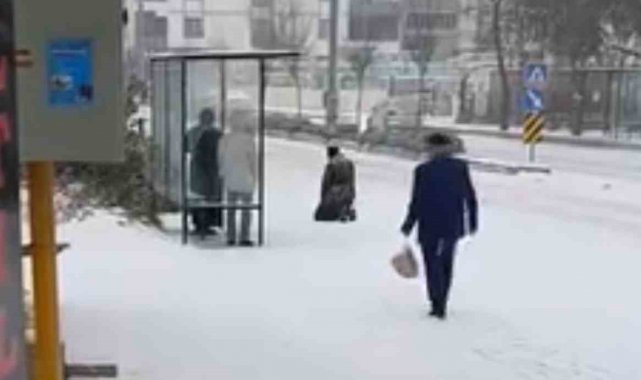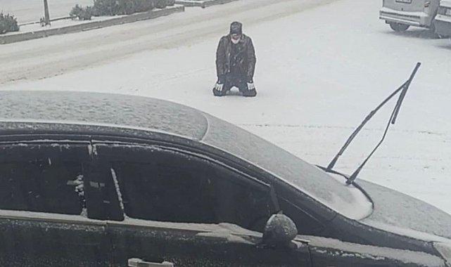 Sabah saatlerinde etkili olan kar yağışı sırasında bir vatandaş, cadde ortasında secde etti. O anlar kameralara yansıdı.