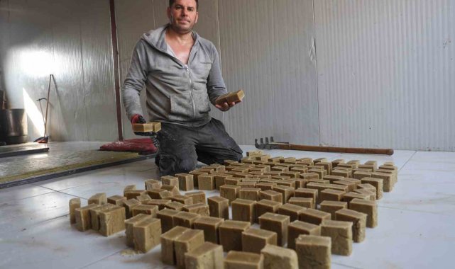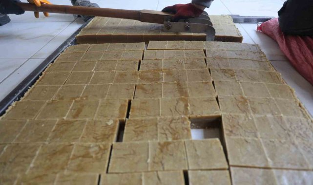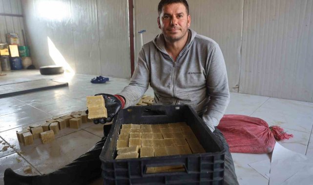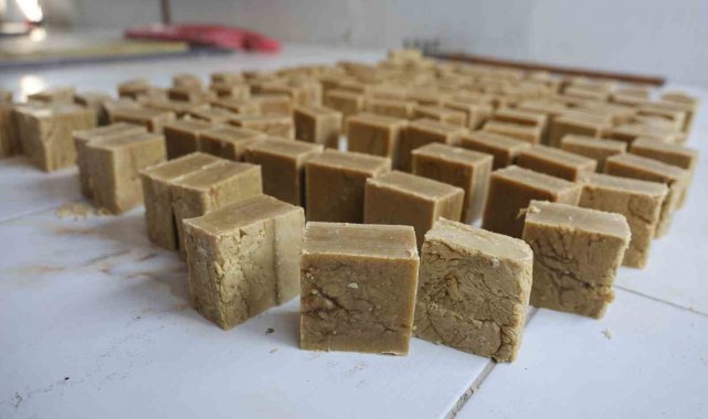 Hatay'da babasından devraldığı sabun üretimini 30 yıldır devam ettiren üretici, bölge halkının vazgeçilmezleri arasında olan ve cilde faydası saymakla bitmeyen zeytinyağlı defne sabunu için mesai yapıyor.