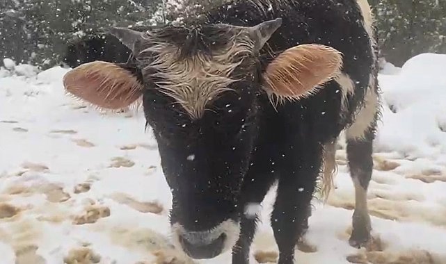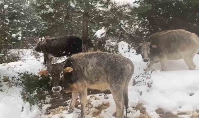 Kara rağmen büyükbaş hayvanlar otlanmaya çıktı