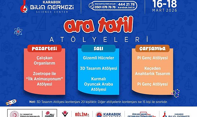 Karabük Bilim Merkezi'nde düzenlenecek program kapsamında "Çalışkan Organlarım", "Zoetrope ile İlk Animasyonum", "Gizemli Hücreler", "3D Tasarım Atölyesi", "Kurmalı Oyuncak Araba Atölyesi", "Pi Genç Atölyesi" ve "Keçeden Anahtarlık Tasarım Atölyesi" gibi etkinlikler gerçekleştirilecek.