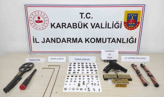 Edinilen bilgiye göre, İl Jandarma Komutanlığı ekipleri tarafından il merkezi ve Safranbolu ilçesinde 2 ayrı operasyonda, 2 şahsın iş yerinde arama yapıldı. Yapılan aramalarda; milattan önce 3. veya 5. yüzyıla ait Antik Mısır dönemine ait olduğu değerlendirilen 1 adet heykel, Bizans, Roma ve Osmanlı dönemlerine ait olduğu değerlendirilen 60 adet sikke, 10 adet tarihi obje, 5 adet tarihi yüzük, 2 adet tarihi kolye ucu ele geçirildi.